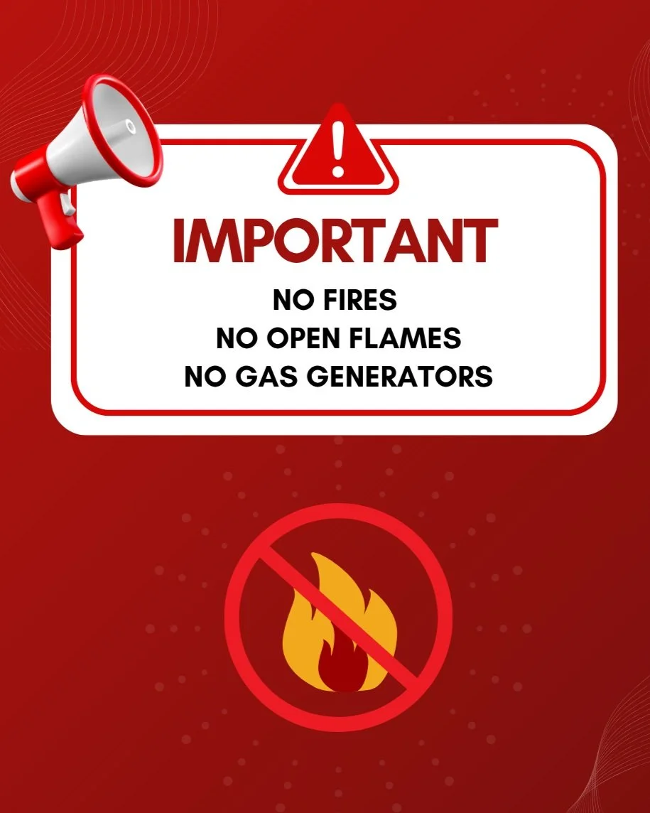 No gasoline generators and no open fires on property.